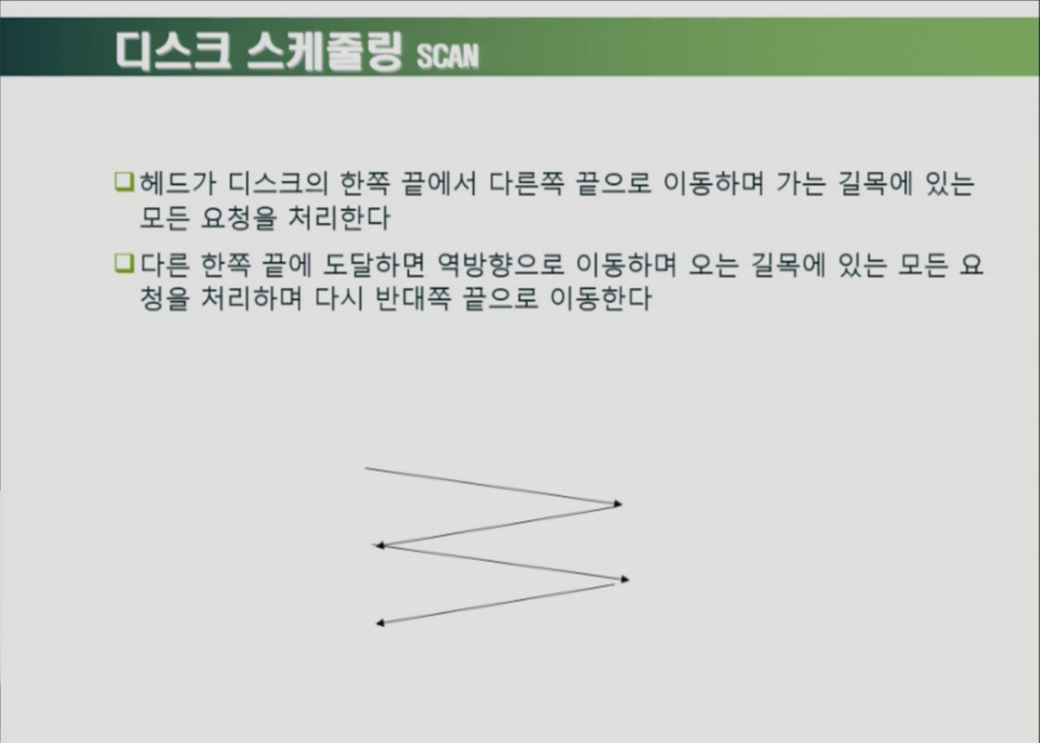 SCAN : 헤드가 디스크의 한쪽 끝에서 다른쪽 끝으로 이동하며 가능 길목에 있는 모든 요청을 처리. 다른 한쪽 끝에 도달하면 역방향으로 이동하며 오는 길목에 있는 모든 요청을 처리하며 다시 반대쪽끝으로 이동